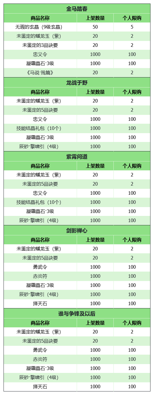 出售商品:(根据不同的服务器开启时间,商品也会不同)