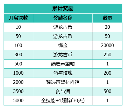 当大侠累计开启一定数量的“珍馐锦盒”,更有可以获得游龙古币、臻选声望、臻选声望材料、碧空翅膀(30 天,全技能 +1 翅膀)等丰厚好礼!