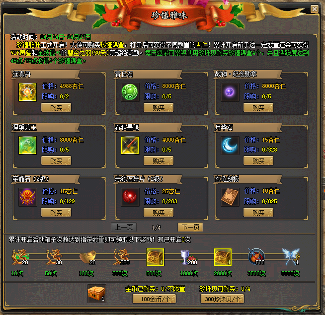 (3)除此外在活动界面也可选择花费100金币购买“珍馐锦盒”。金币选购不限制数量,开启“珍馐锦盒”时可随机获得不同数量的活动代币【杏仁】。