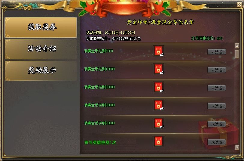 1、活动期间达成以下条件,即可领取道具:财运红包,参与抽奖活动!