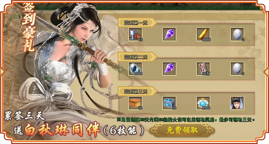 新服【龙战于野】自创建角色起35天内,达到60级且累计签到三天,即可免费领取具有强力的6技能同伴-白秋琳!此外还将获得大量的绑金、五行魂石、珍珠贝等好礼!