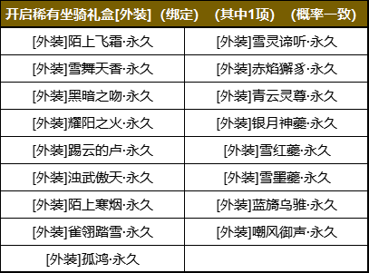 当幸运大侠祈愿中稀有外装礼盒&稀有坐骑外装礼盒时,将会随机获得以下其中一套精美的稀有外装礼盒或稀有的坐骑外装!
