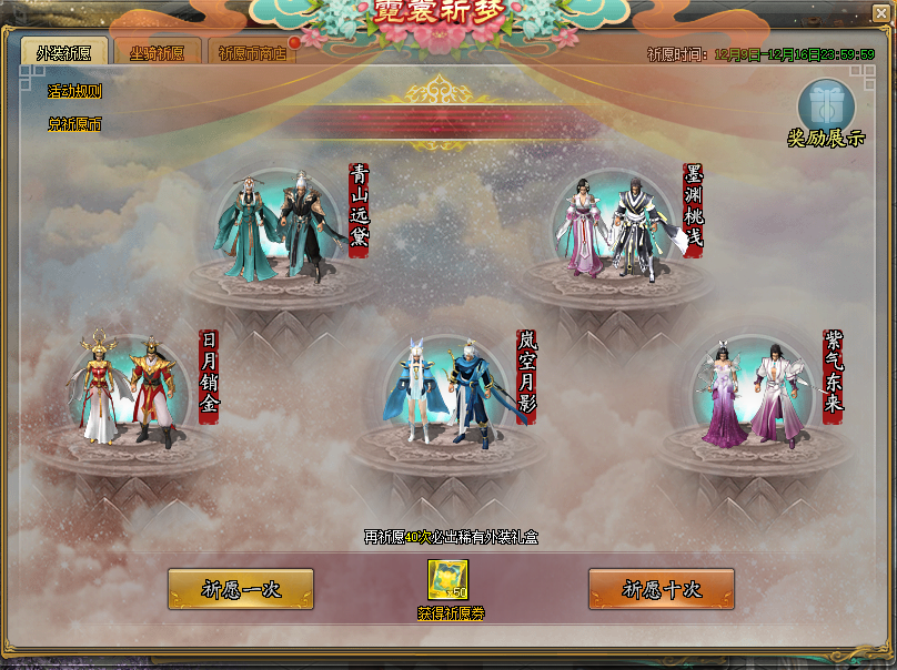 6、本次活动的年度外装祈愿活动、免费领取祈愿币将在12月16日23:59后结束,但兑换祈愿币和祈愿币商店将会保持开启至12月31日23:59,供各位大侠选兑外装。