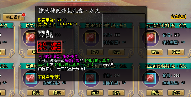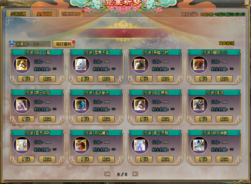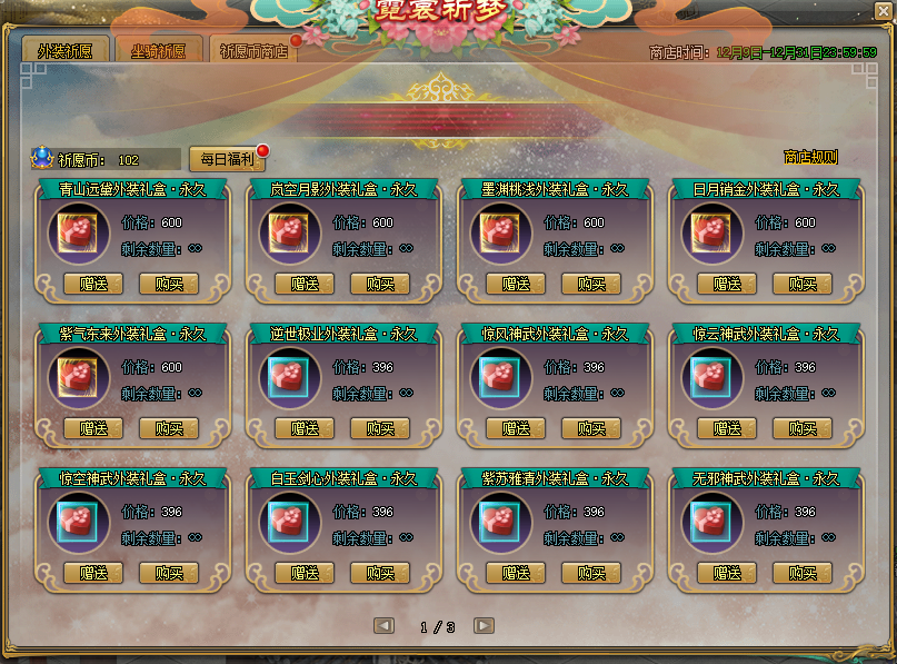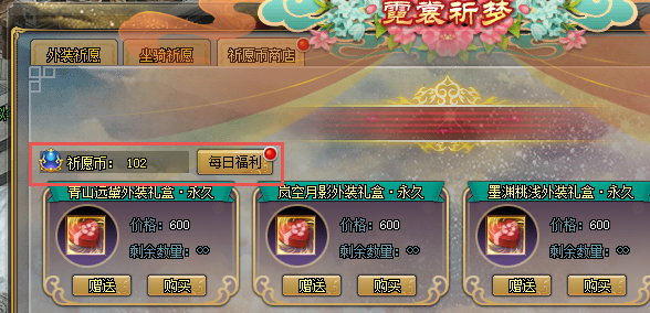 5、本次祈愿币商店的商品将支持[赠送]功能。大侠已收集的外装礼盒&坐骑外装礼盒可在商店中选择赠送给好友,未收集的外装则不可赠送。
