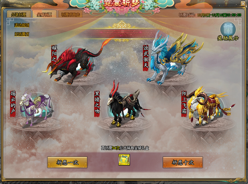 4、大侠在连续进行外装祈愿39次未获得稀有礼盒时,第40次祈愿必定中得1份稀有外装礼盒。进行坐骑外装祈愿连续59次未获得稀有坐骑外装礼盒时,第60次祈愿必定中得1份稀有坐骑外装礼盒。外装祈愿与坐骑祈愿的必出稀有礼盒次数不共用。