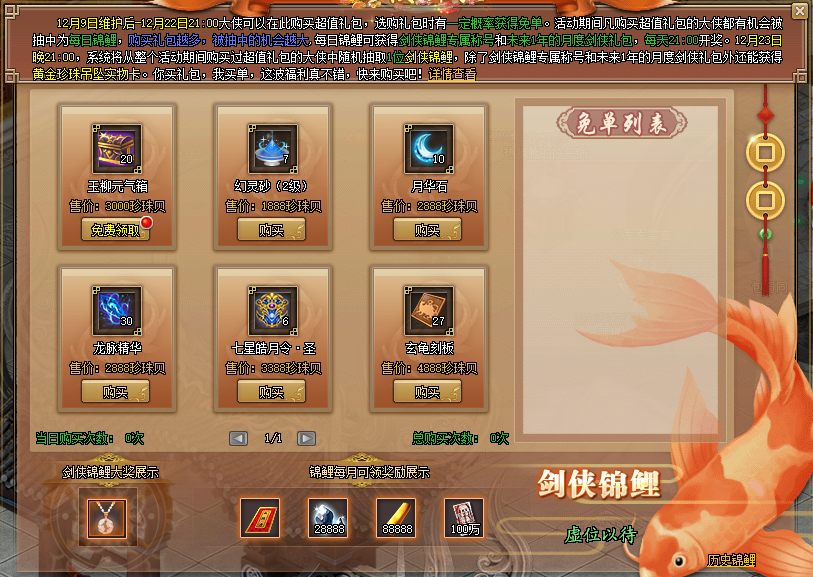 1、12月9日维护结束后-12月22日21:00期间,购买活动礼包的大侠,即可参与锦鲤抽奖,购买的礼包越多,被抽中为锦鲤的机会越大!