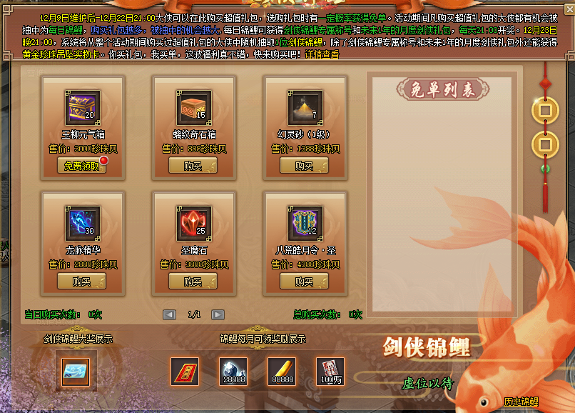 1、12月9日维护结束后-12月22日21:00期间,购买活动礼包的大侠,即可参与锦鲤抽奖,购买的礼包越多,被抽中为锦鲤的机会越大!
