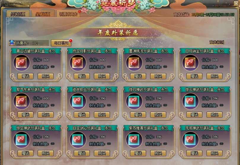 5、本次祈愿币商店的商品将支持[赠送]功能。大侠已收集的外装礼盒&坐骑外装礼盒可在商店中选择赠送给好友,未收集的外装则不可赠送。