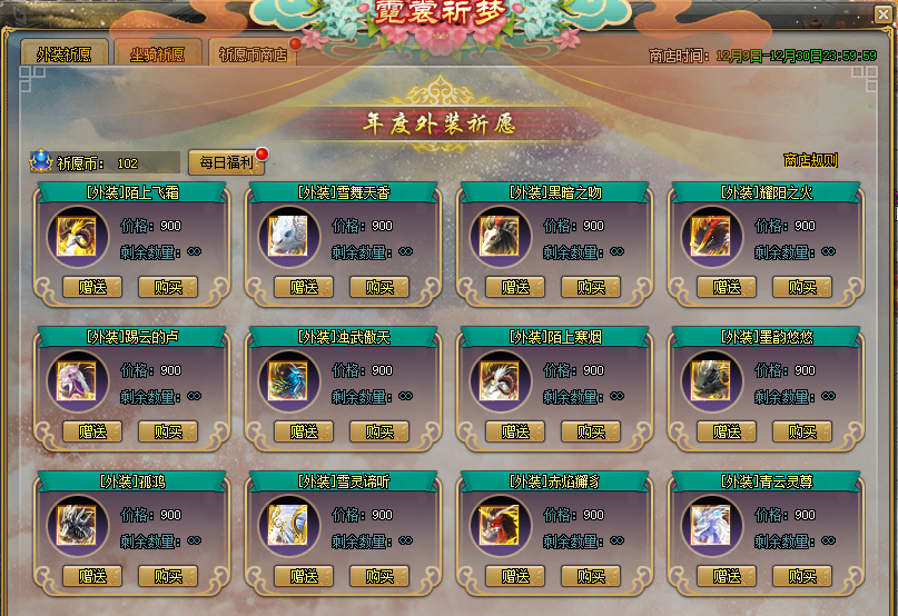 6、本次活动的年度外装祈愿活动、免费领取祈愿币将在12月16日23:59后结束,但兑换祈愿币和祈愿币商店将会保持开启至12月31日23:59,供各位大侠选兑外装。